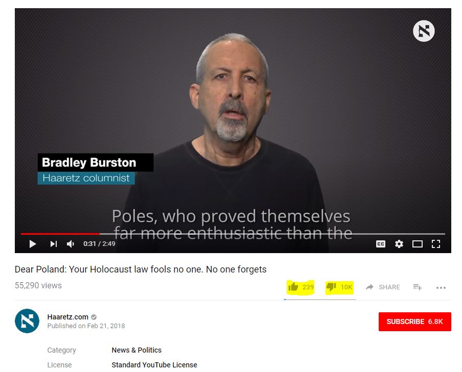 I think it is safe to say that people are getting sick of the kikes and their whining about the Holohoax. The Israeli media outlet Haaretz put out a clip criticizing Poland for their new law which makes it illegal to blame Poles for the Holohoax. It has received over 10,000 dislikes compared to just over 200 likes.